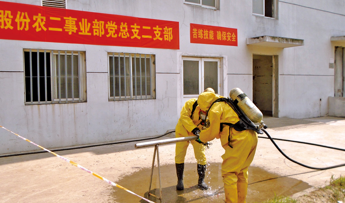 6月6日下午農(nóng)一事業(yè)部雙甘膦分廠組織氨回收送農(nóng)二事業(yè)部液氨管道泄漏預(yù)案演練,事業(yè)部總經(jīng)理孟長(zhǎng)春擔(dān)任演練總指揮。6月19日,I草丙班與雙甘膦丙班聯(lián)合進(jìn)行了液氨槽裝卸管道泄漏演練。演練前值長(zhǎng)按照以往演練出現(xiàn)問(wèn)題對(duì)原預(yù)案進(jìn)行了修改,并且進(jìn)行了泡沫消防炮、防化服穿戴專項(xiàng)訓(xùn)練。