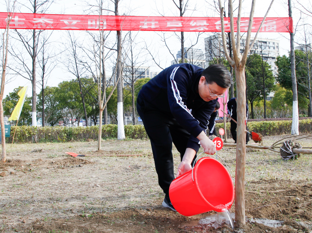 春風(fēng)和煦,萬物萌生,在位于通呂運河綠廊星島水岸段的植樹現(xiàn)場,張劍橋董事長、顧建國總經(jīng)理與集團(tuán)其他領(lǐng)導(dǎo)帶領(lǐng)大家一起熱火朝天地?fù)]鍬鏟土、扶苗填坑、培實新土、提水灌溉。大家熱情高漲、干勁十足、二三人一組、分工協(xié)作,共同種下50余棵紫薇樹苗,牢固樹立和踐行了“綠水青山就是金山銀山”的理念,為推進(jìn)新時代生態(tài)文明建設(shè)、建設(shè)美麗南通貢獻(xiàn)產(chǎn)控力量。